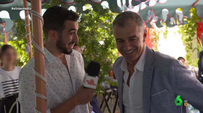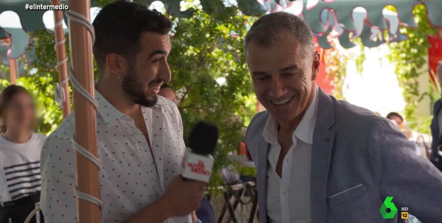 El nuevo reportero de El Intermedio, Isma Juárez, se ha desplazado hasta el acto de proclamación de Isabel Díaz Ayuso como presidenta de Tabarnia, la región imaginaria que surgió como contraposición satírica a la deriva independentista durante los años del procés. Y en él se ha encontrado a Toni Cantó: "He visto que me estaba mirando desde allí", dice al mismo tiempo que se acerca a su mesa. "¿Se puede levantar un poco? Es para tener el tiro guapo de cámara", le pide, y el que fuera de Ciudadanos lo hace sin dudarlo un segundo.