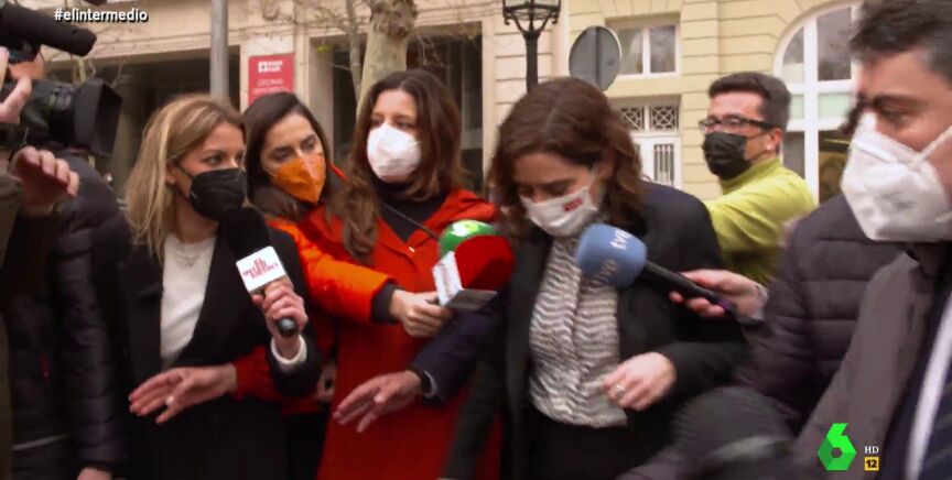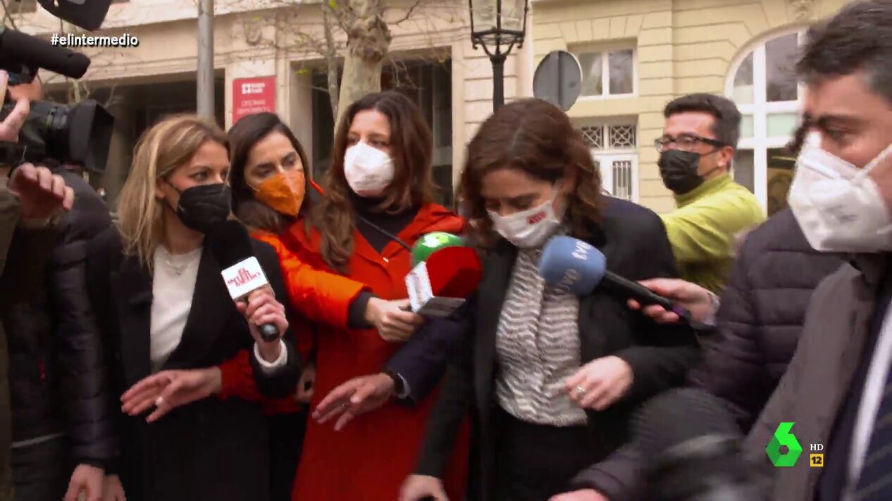 La presidenta de la Comunidad de Madrid ha ofrecido unas breves declaraciones a la periodista Andrea Ropero, que la ha cuestionado por sus críticas al plan de Igualdad.