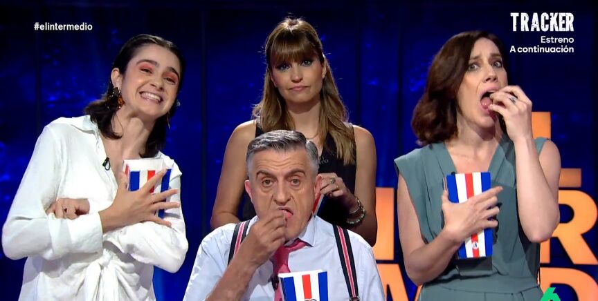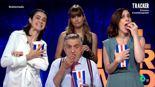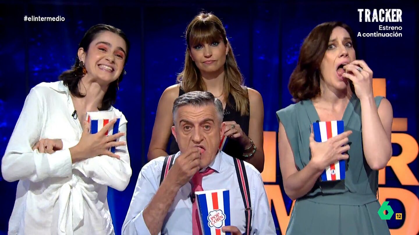 El Intermedio convierte la comparecencia de Leire Díez y la irrupción de Aldama en una película de Berlanga, 'El sainete nacional', que tiene totalmente enganchados a Wyoming, Sandra Sabatés, Inés Rodríguez y Cristina Gallego.