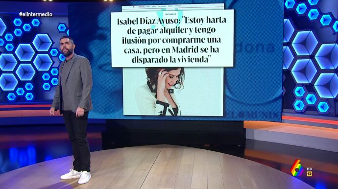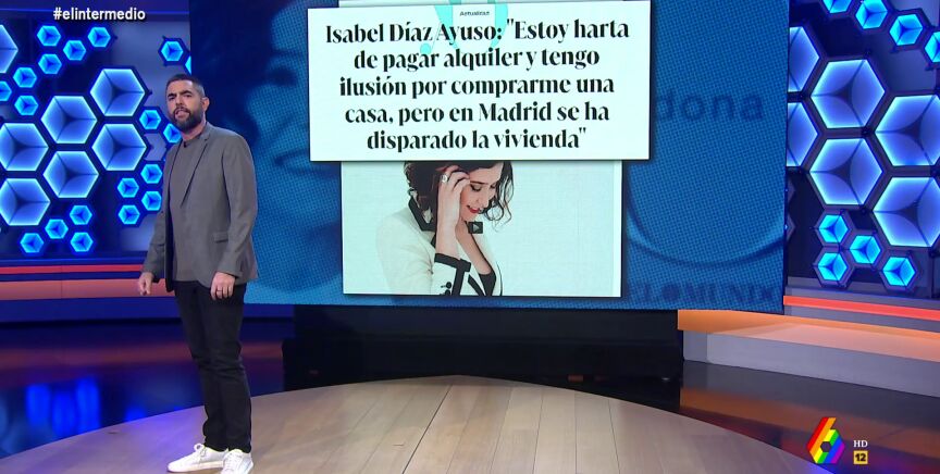 "Ya estáis ahí la dictadura progre siempre fijándose en los mismos colectivos vulnerables", ironiza Dani Mateo, que destaca en el plató de El Intermedio que "también hay otros colectivos pasándolo mal": "Por ejemplo,el colectivo de presidentes de comunidades autónomas". "No os hagáis los sorprendidos, sé que todos habéis leído el último titular de Isabel Díaz Ayuso", resalta Dani Mateo, que muestra las declaraciones de la presidenta madrileña en las que afirma que está harta de pagar el alquiler y se quiere comprar una casa, pero en Madrid se ha disparado el precio de la vivienda.