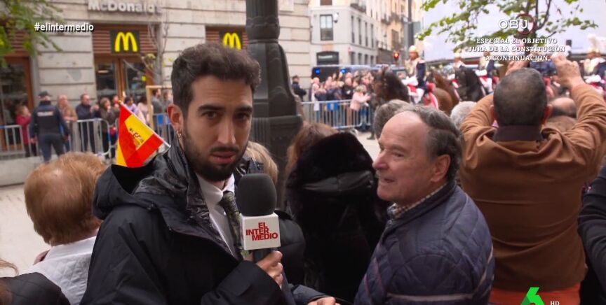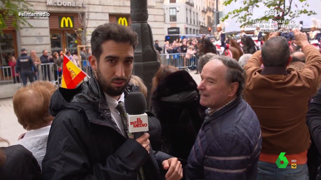 Isma Juárez alucina con el paso de la caballería de la Guardia Real con trompetas y tambores, pero le gustaría que tocaran una canción de Bad Bunny, algo que no sienta bien a un señor que está esperando el paso de la comitiva real: "No estamos para cachondeo. Ya está bien, estamos para lo que estamos"."No sabía que había alguien que podía odiar tanto el reggaetón", comenta el reportero tras la reprimenda. Poco después aparecen los reyes, que le saludan, así como la princesa y la infanta, en un segundo coche, y este aprovecha para felicitarla por su cumpleaños.