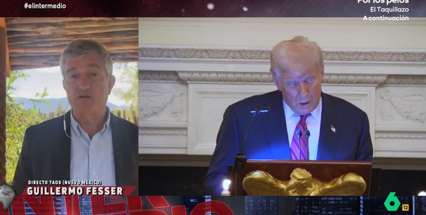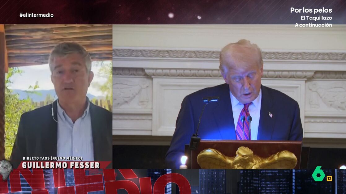 Guillermo Fesser conecta con el plató de El Intermedio para analizar junto a El Gran Wyoming la llegada de Donald Trump a Reino Unido junto a su mujer, Melania Trump. Y es que, como afirma el presentador de El Intermedio, "le han recibido con honores de rey". "No había bufón real porque Elon Musk ya no le adjunta", asegura Wyoming.