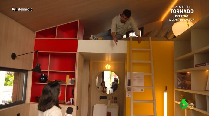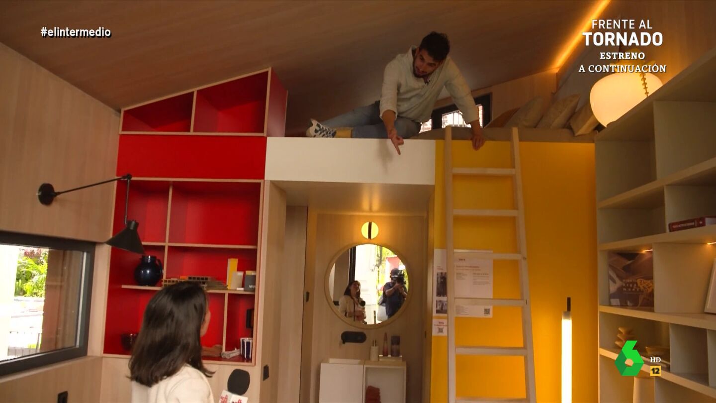 Por su parte, un experto de decoración le asegura al ver su foto de comunión que "mis padres también tienen una, pero yo era más guapo", si bien le ayuda a buscarle un lugar apropiado. Finalmente, el reportero descubre "algo que me puedo permitir", un compacto espacio con la cama cerca del techo. "Desde aquí, que soy de Mallorca, puedo hacer balconing para ir a desayunar", comenta desde arriba.