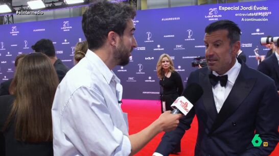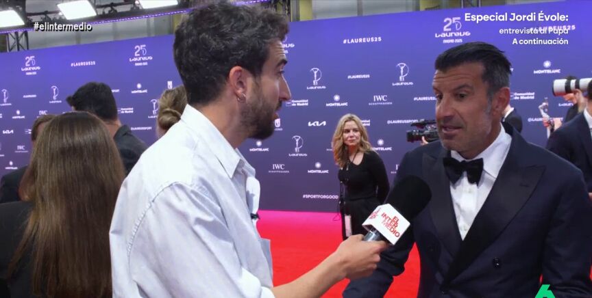 "Pareces defensa, Figo", añade el reportero, "¿Hemos ganado un seguidor de El Intermedio?". "No, sois muy rojos", responde él. "Mañana nos ves", le sugiere Isma. "No veo laSexta", se sincera el futbolista, lo que provoca la risa de Juárez. "A mí me ha ganado", confiesa el reportero.