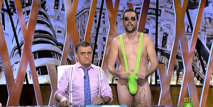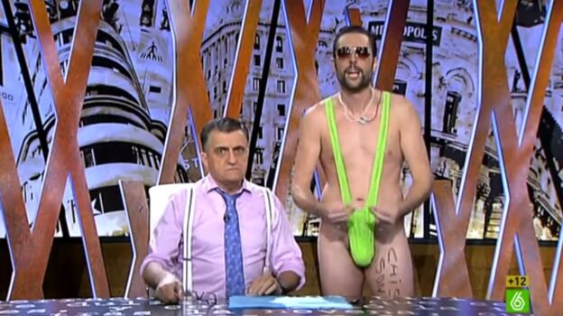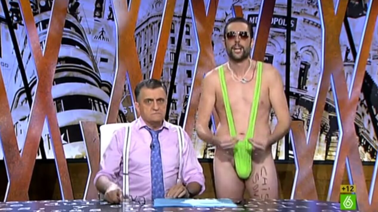 Uno de los vídeos más recordados del periodista es el de su triunfal entrada en el plató trasirrumpir 'a lo Femen' con el llamativo tanga verde de Borat. Un momentazo que dejó a El Gran Wyoming a cuadros.