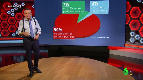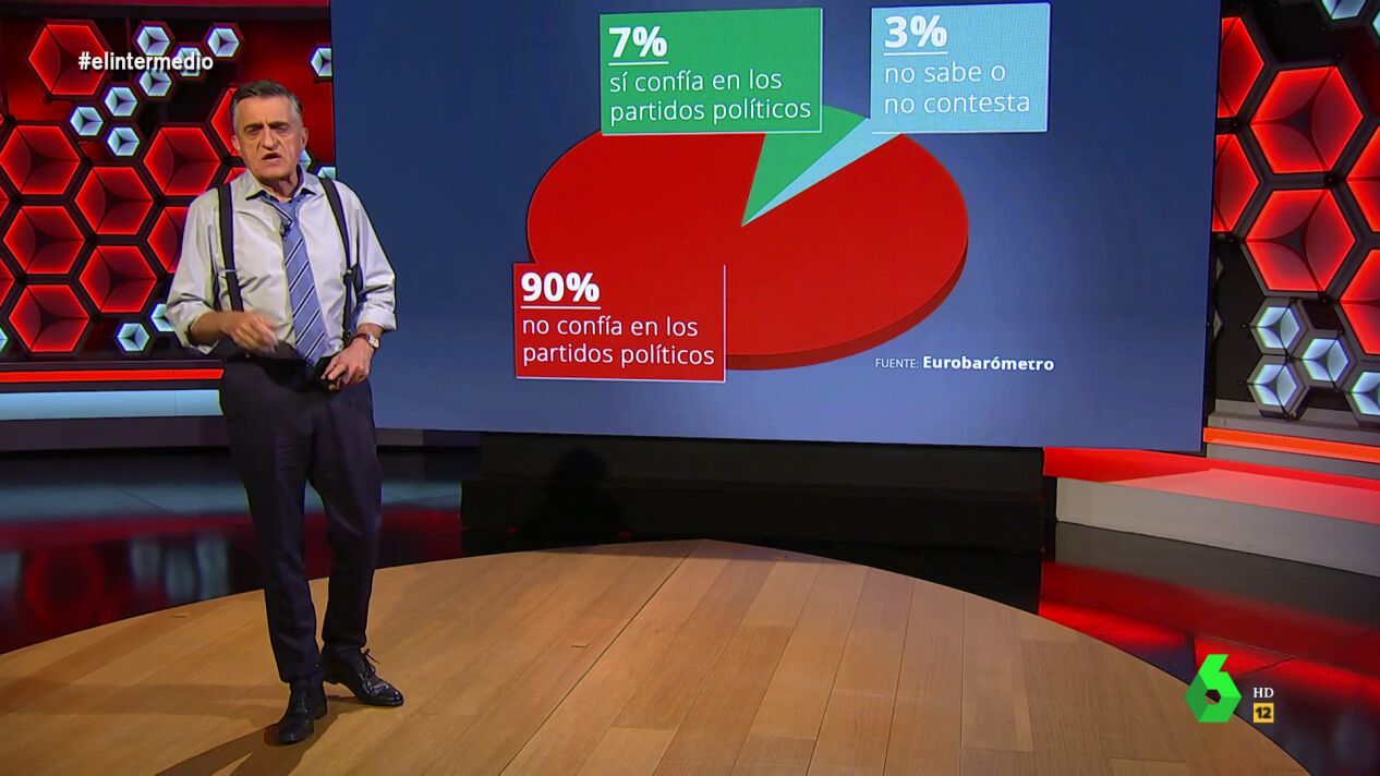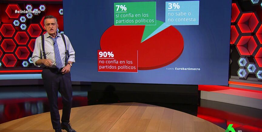"¿Qué nos pasa con la política?", se pregunta El Gran Wyoming, que reconoce que "vemos tertulias política, discutimos de política, dejamos de hablar a algunos familiares por culpa de la política, pero al mismo tiempo que condiciona nuestra vidas sentimos un gran rechazo hacia ella". Y es que según datos del Eurobarómetro, el 90% de los españoles desconfía de los políticos.