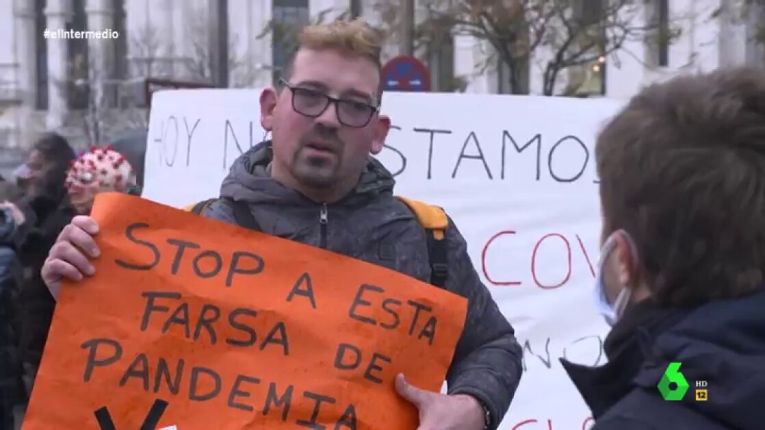 Pablo Ibarburu ha entrevistado durante una manifestación antivacunas en Madrid a diferentes personas que aseguran que la pandemia de coronavirus no existe. El periodista pregunta a uno de los que se movilizan por el uso de la mascarilla: "Cuándo la comunidad científica recomienda algo para prevenir un mal, ¿tú no lo utilizas? "No te voy a pedir perdón por no llevarla porque no creo en ella", dice el hombre.