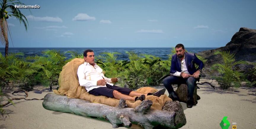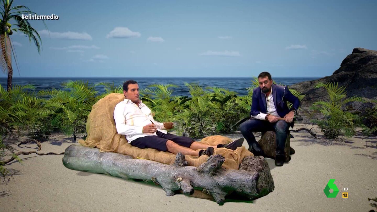 "No se está mal en 'la isla de los políticos perdidos', en el bufete hacía lo mismo pero cobrando", admite 'Albert Rivera', que llama la atención a 'Pablo Iglesias' por no parar quieto y le pregunta qué hace con un saco.