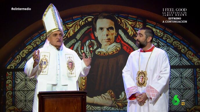 La 'Iglesia Aznariana' se reúne una vez más para celebrar la última aparición de Aznar. "El 'Aznarísimo' está muy ocupado, de lunes a sábado salva a España de todas sus amenazas y el domingo se manifiesta para seguir salvando España", asegura el 'Papa Wyoming', y el 'monaguillo Mateo' aclara que "es como un autónomo, nunca tiene vacaciones".