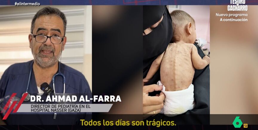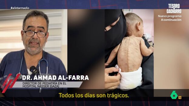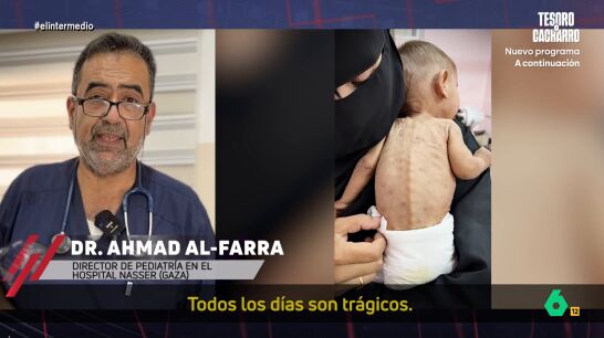 "La cantidad de niños con desnutrición severa está aumentando por culpa del hambre", explica el doctor, que destaca que el día anterior atendieron a 140 niños: "Nunca habíamos visto nada así". Además, Ahmad Al-Farra explica que en las últimas dos semanas se están quedando "sin leche de fórmula en el hospital".