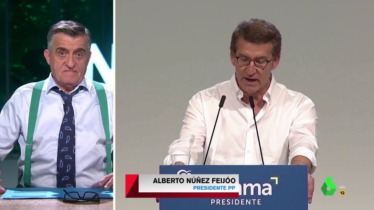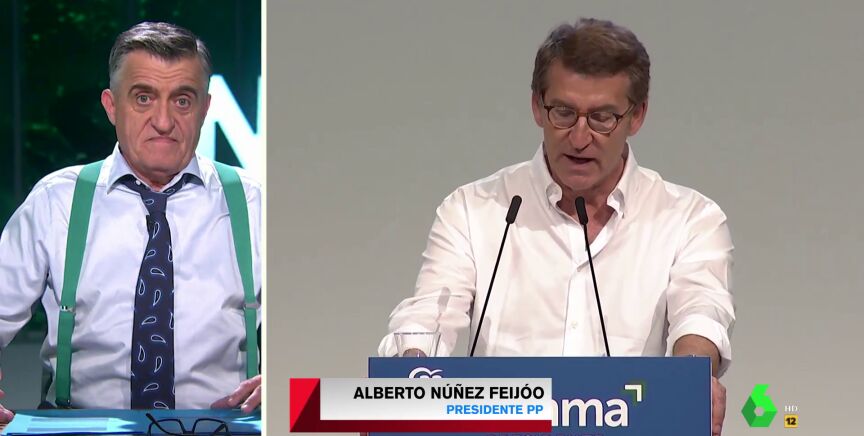 Junto a Sandra Sabatés, también ha repasado los actos de campaña del fin de semana en las distintas formaciones políticas, donde la mayoría de candidatos han estado arropados por los líderes de sus respectivos partidos. Es el caso de Juanma Moreno, que estuvo acompañado de Alberto Núñez Feijóo, que como apunta Wyoming "está cada vez más a tope con Andalucía". Así lo demuestran sus distintos discursos en los que no reparaba en halagos hacia varias ciudades como Córdoba, Málaga o Cádiz. "Ha sido presidente de la Xunta 12 años, pero en dos días se ha vuelto más andaluz que Juan y Medio", bromea el presentador de El Intermedio en el vídeo sobre estas líneas.