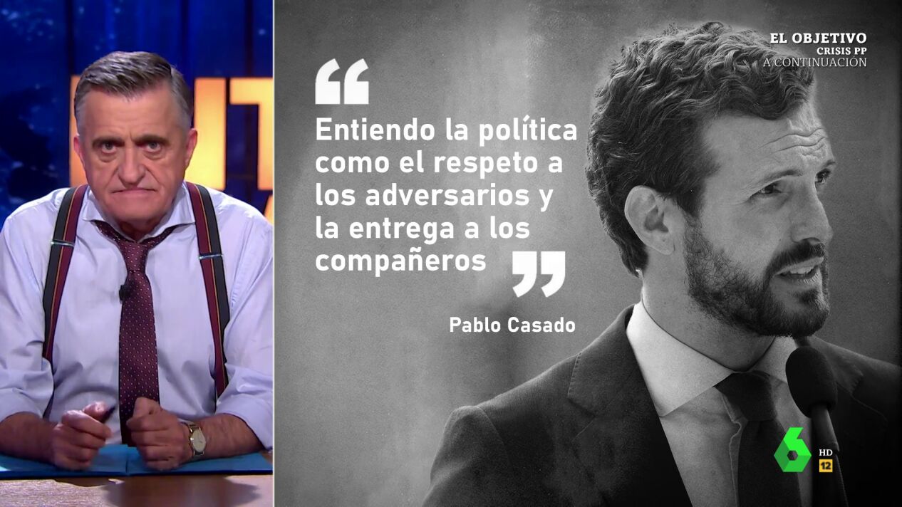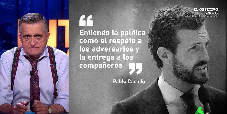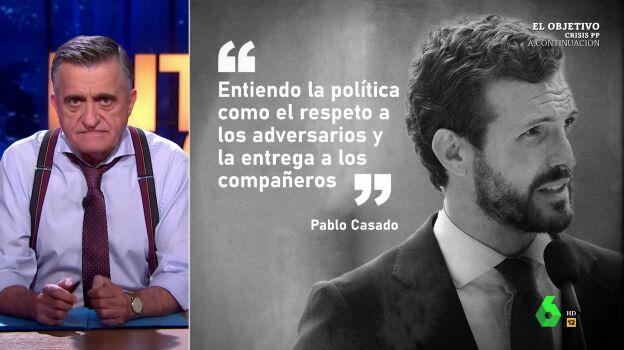 En su discurso, Casado ha dicho que entiende la política como "el respeto a los adversarios y la entrega a los compañeros", unas declaraciones que también analiza el presentador. "La entrega literal, les ha entregado a su compañeros su cabeza y la de García Egea", ha apuntado.
