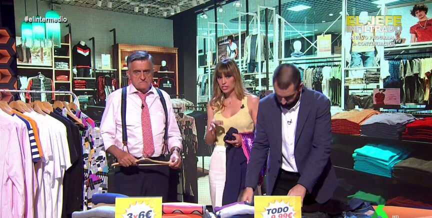 El Gran Wyoming y Sandra Sabatés acuden a la tienda para analizar el consumo de ropa. La presentadora indica que los españoles compramos una media de 34 prendas al año, una cantidad "elevadísima", señala, aunque alejada de la media de Estados Unidos, donde asciende a 60 prendas al año. "Estos datos son absolutamente inasumibles", señala Sabatés, si tenemos en cuenta que para cumplir con el Acuerdo de París, que pretende limitar el calentamiento global a 1,5 grados, no deberíamos comprar más de cinco prendas nuevas al año.