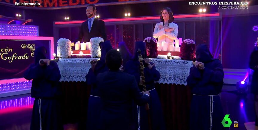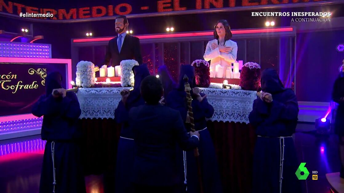El plató de El Intermedio vuelve a vivir, como ya es tradición por Semana Santa, su propia procesión. Esta vez, quienes llegan a plató son 'Santa Isabel Díaz Ayuso de Todos los Bares y San Pablo Nuestro Señor del Abandono y Patrón de los Traicionados. "Ya huele a fe, incienso y, tratándose de estos personajes, a traición", presenta El Gran Wyoming.