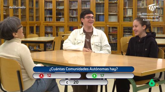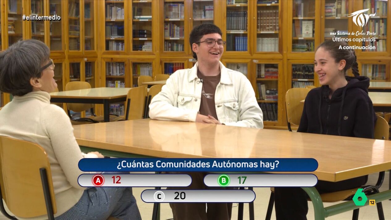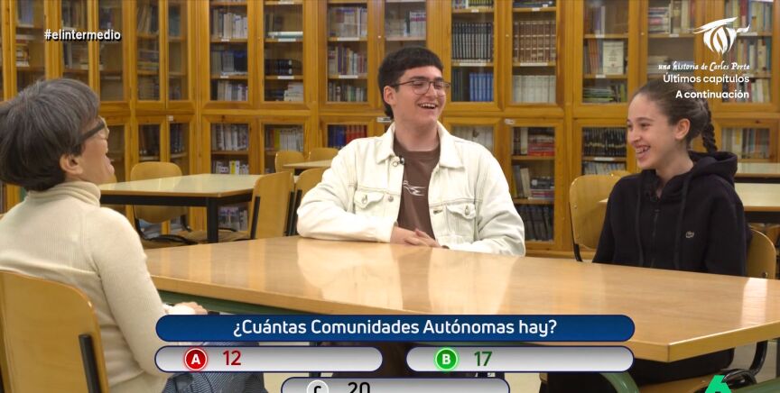 Para ello, recurre a las preguntas que normalmente se plantean a los extranjeros que solicitan la nacionalidad española. Una de ellas es: ¿cuántas comunidades autónomas hay? Sin embargo, las respuestas desconciertan a la periodista. "Madre mía, qué crudos vamos", comenta avergonzado uno de los adolescentes al darse cuenta de que no sabe la respuesta correcta.