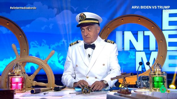 El Gran Wyoming da la bienvenida a la última entrega de El Intermedio de la temporada vestido de marinero. "¡Qué bien te sienta el uniforme!", no puede evitar reaccionar Sandra Sabatés al verle, y le halaga diciéndole que está "muy elegante". "Pues me tienes que ver con el de enfermera", responde él.