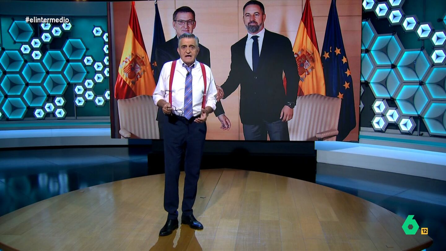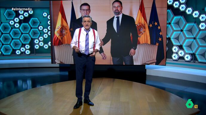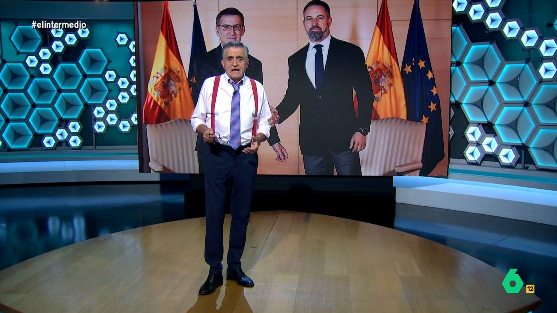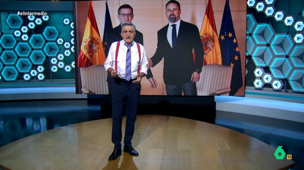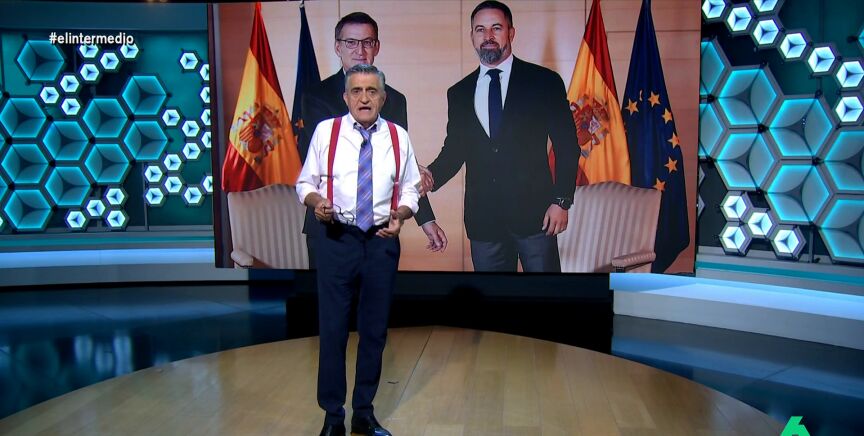 "¿Os imagináis algo parecido en España?", pregunta el presentador, que recuerda cómo la derecha española "no ha tenido reparos en arrojarse en brazos de los ultra". "Han naturalizado pactar con ellos", dice; ya que han colado en las más altas instituciones "extremistas xenófobos y negacionistas de la violencia machista".