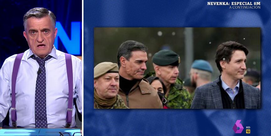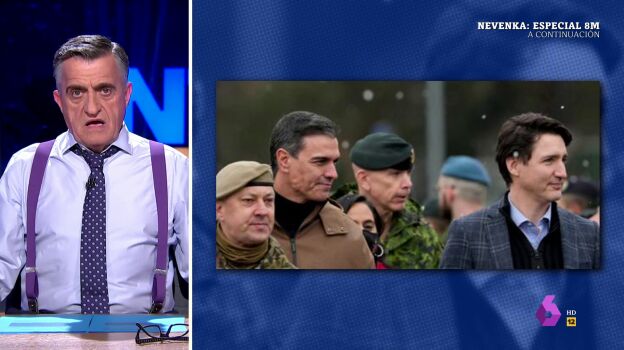 En El Intermedio, Sandra Sabatés y El Gran Wyoming han analizado las palabras de Sánchez en las que advierte a Putin de que "está solo y la mayoría del mundo apoya a Ucrania". En este sentido, Wyoming ha dejado claro lo que implica para el presidente ruso perder el apoyo de los mandatarios de España y Canadá: "No solo son guapísimos, también son la solución perfecta para lograr la paz", comenta en el vídeo sobre estas líneas un Wyoming alucinado con la foto que reúne a Sánchez y Trudeau.