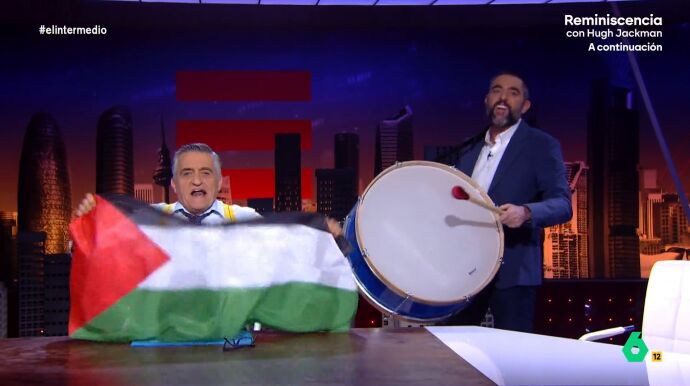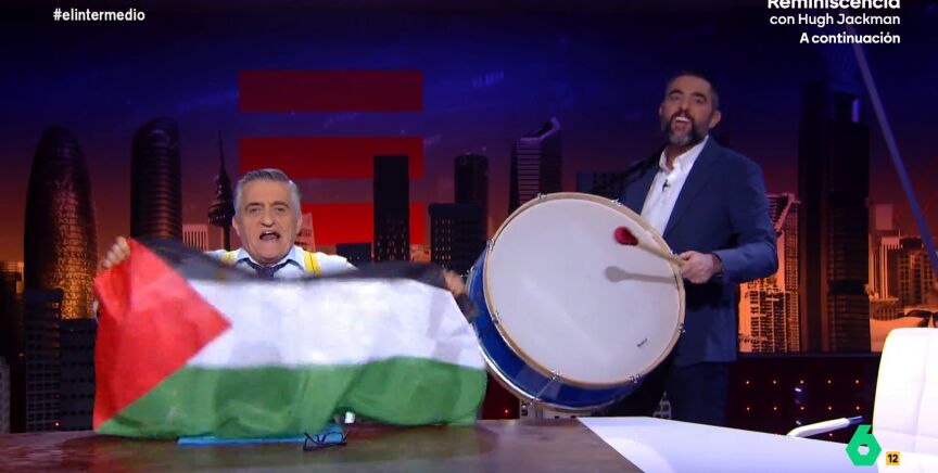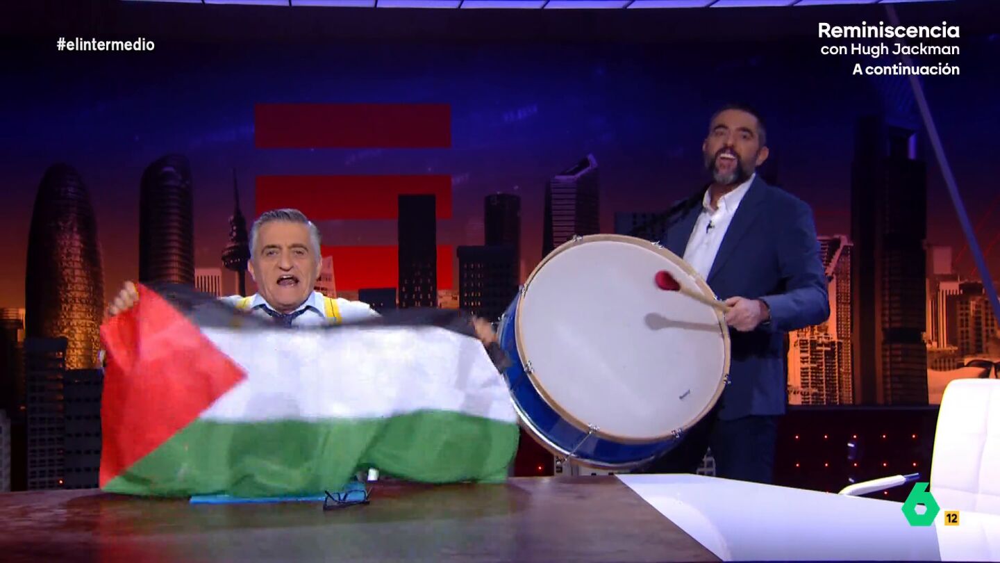 Dani Mateo aparece con un bombo para acompañar a Wyoming en su cántico futbolístico y el presentador muestra una bandera de Palestina. "Cómo no te voy a querer, cómo no te voy a querer, si has chafado el mundial a los de Israel", cantan.