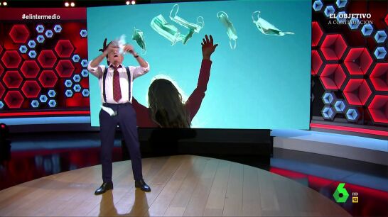 "Hoy es el día uno sin mascarillas", con estas palabras da comienzo El Gran Wyoming el programa de El intermedio de este miércoles, 20 de abril. "¡Vámonos!", gritaba al mismo tiempo que lanzaba unos cuantos ejemplares de cubrebocas al aire mientras sonaba por detrás la canción 'Libre', de Nino Bravo.