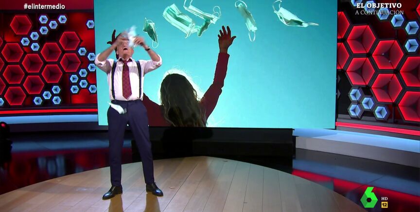 El Gran Wyoming dice adiós a las mascarillas en pleno directo de El Intermedio. Así ha sido su particular despedida tirando al aire unos cuantos ejemplares que tenía en su bolsillo: "¡Vámonos!", se escucha decir eufórico al presentador