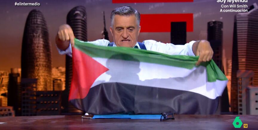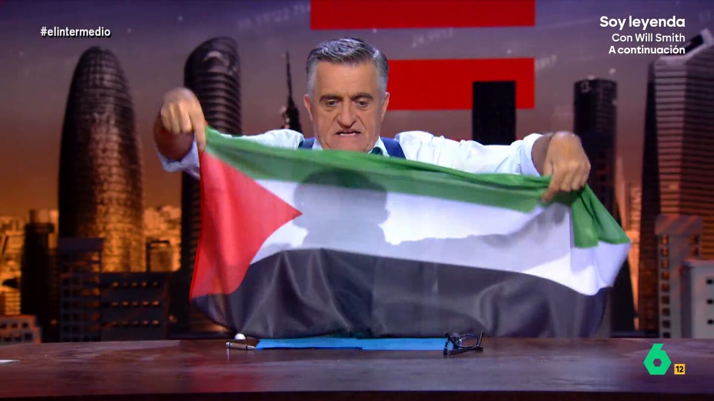 El presentador de El Intermedio anuncia que le han entrado "unas ganas enormes" de sacar una bandera de Palestina, que pone en la mesa frente a él, lo que provoca los aplausos del público. "¿A ti te molesta, Sandra?", pregunta a su compañera. "Nada, al contrario", responde ella. "Y esta es la razón por la que nunca llegarás a presidenta de la Comunidad de Madrid", expone Wyoming.