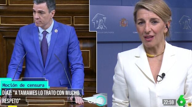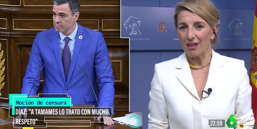Yolanda Díaz, una de las protagonistas de la moción de censura ha atendido a El Objetivo para contar las claves de una intervención que se ha dado con la "cooperación" de Pedro Sánchez, con quien guarda una "buena relación personal". "Conocíamos las líneas de los debates y hemos hecho lo que teníamos que hacer", defiende.