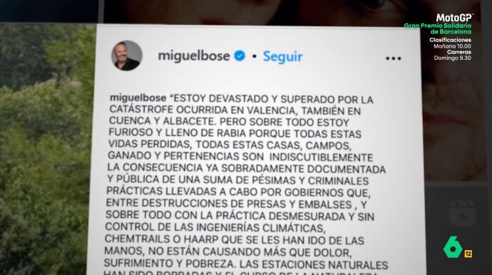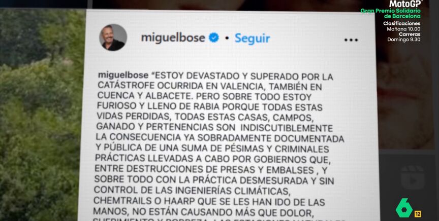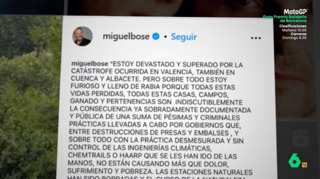 En un post de Instagram asegura que el fenómeno meteorológico que sacude Valencia y deja tras de sí más de dos centenares de muertos, es fruto de los 'chemtrails'. Es una teoría conspiratoria basada en que las estelas dejadas por los aviones a gran altura son en realidad estelas químicas soltadas intencionadamente con fines nefastos no revelados a la población.