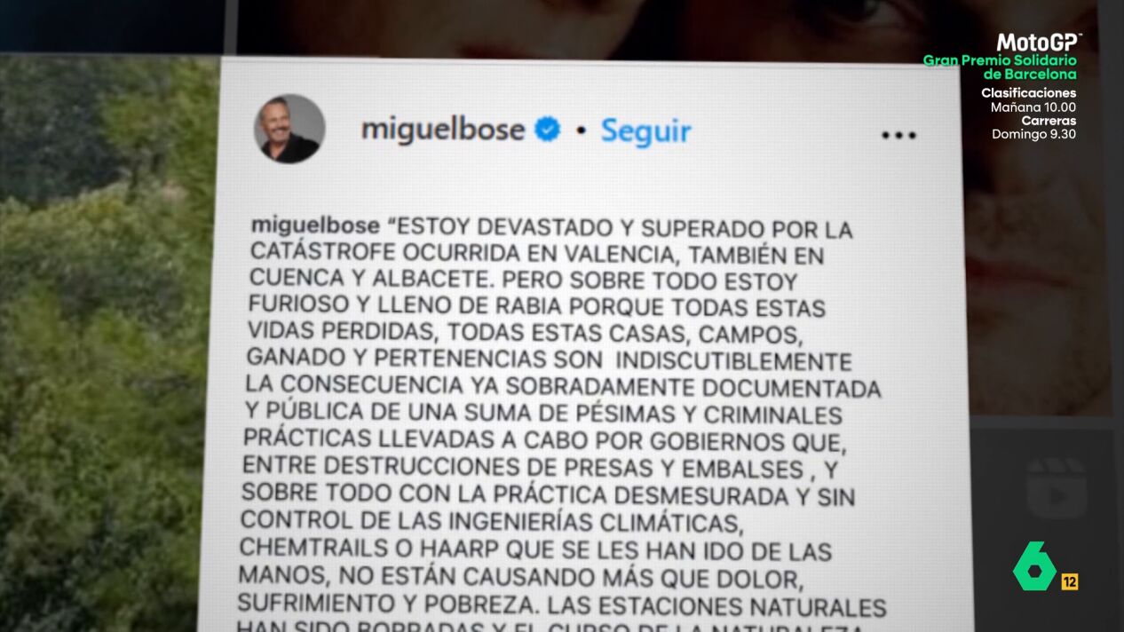 Miguel Bosé sigue aferrado a su discurso negacionista, el cual no ha querido defender en Equipo de Investigación tras rechazar la invitación del programa para entrevistarle. Un discurso que ha pasado de las vacunas por el COVID a la DANA, una tragedia que ha destrozado la Comunidad Valenciana, pero que el artista niega que sea debido al cambio climático.