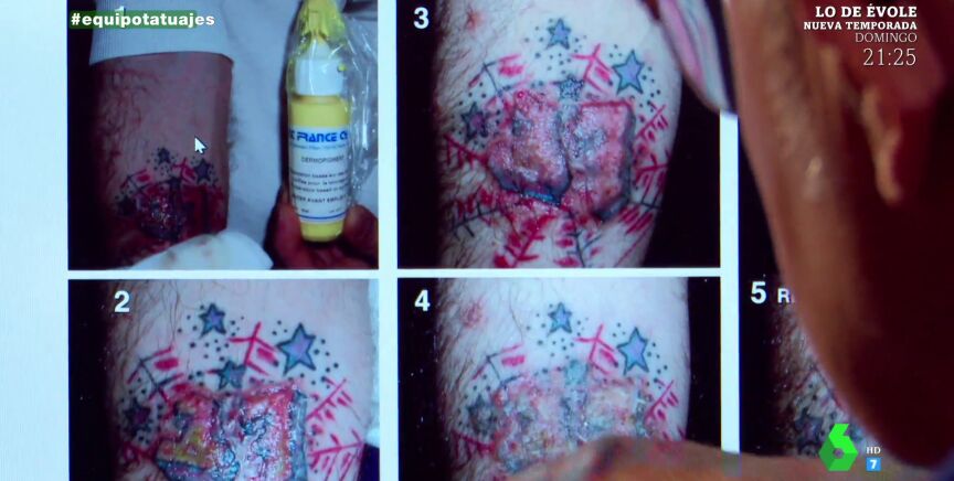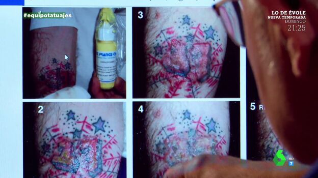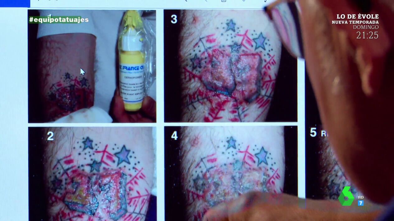 Donís Muñoz, un dermatólogo que desde hace más de 15 años estudia el mundo el tatuaje, muestra a Equipo de Investigación las impactantes imágenes de la reacción alérgica que tuvo un paciente a la tinta de un tatuaje. "No había manera humana de frenar la reacción inflamatoria que experimentó", recuerda, a lo que añade que "al final se solucionó tras nueve meses de un incesante picor con una exudación diaria".