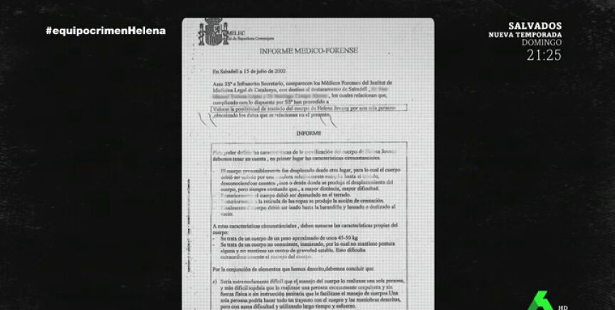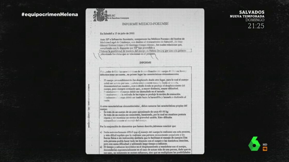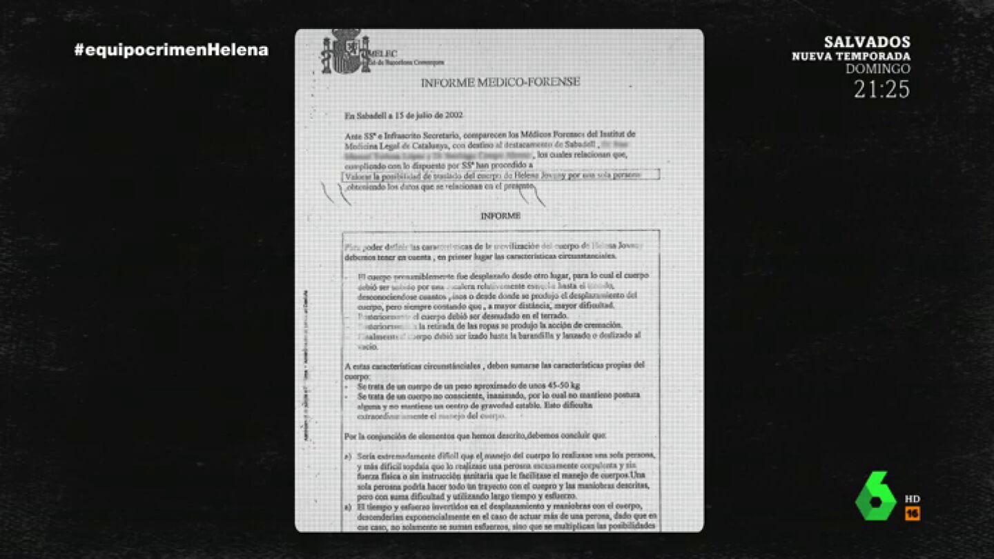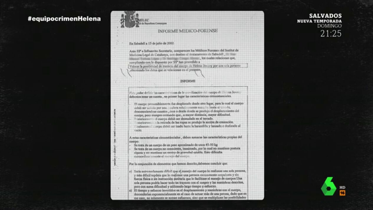 La autopsia apunta a que al ser un cuerpo no consciente, inanimado, eso dificulta extraordinariamente el manejo. Y concluye que la posibilidad de que todas esas acciones las realizase en solitario una persona de corpulencia similar a la de Helena Jubany es sumamente remota.