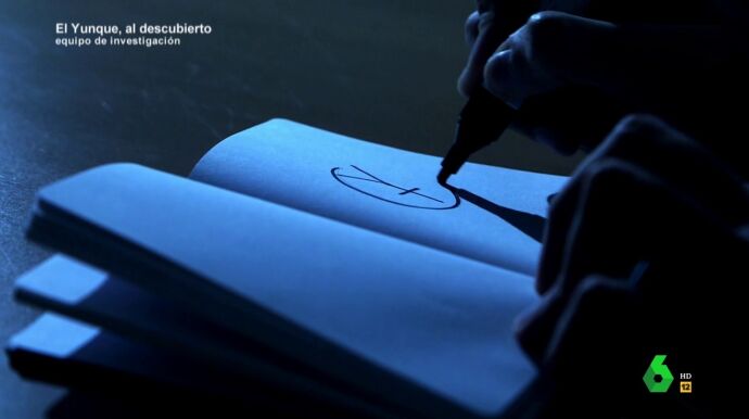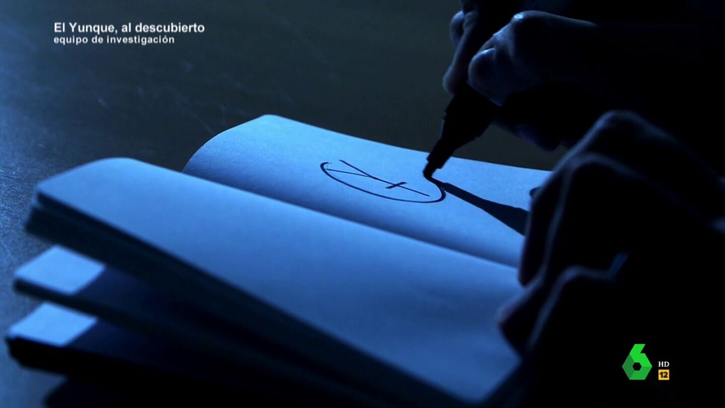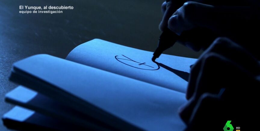 "Me meten en una habitación en la que todo está en penumbra. Hay una mesa y en la mesa dos velas encendidas. Hay tres estandartes en la pared, uno de 'El Yunque', otro de España y otro de El Vaticano [...] en un yunque pequeño había un símbolo, el de la organización. Es una especie de Y con un palo transversal en la parte inferior y un círculo que lo rodea todo", añade.