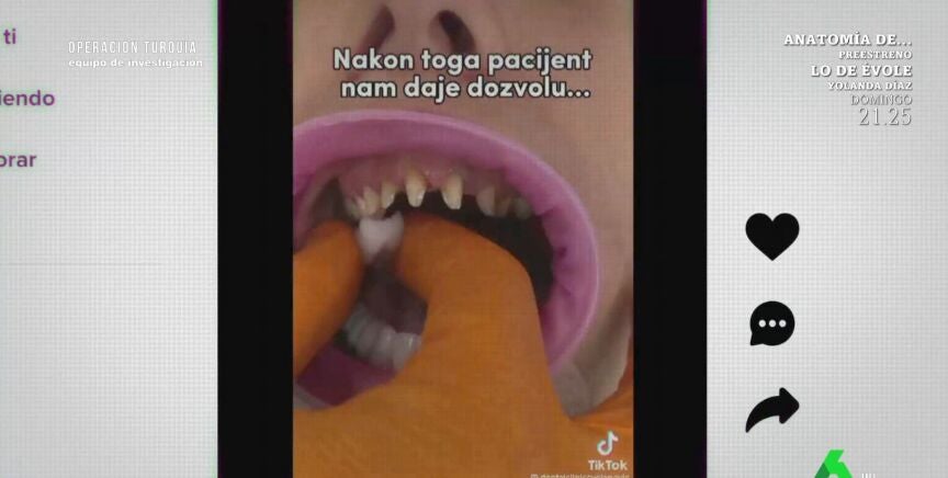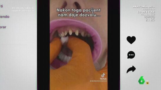 En Reino Unido, los odontólogos alertan de la moda de la 'sonrisa de Hollywood': limar todas las piezas dentales y cubrirlas con coronas. Equipo de Investigación consulta al respecto al odontólogo Francisco Ibáñez, que la tacha de "salvajada". "Lo que estoy viendo ahí es que han sacrificado un montón de tejido dental sano en una chica muy joven para colocar coronas en todos los dientes", resume el especialista, tras ver algunos vídeos de TikTok que se hacen eco de esta tendencia.