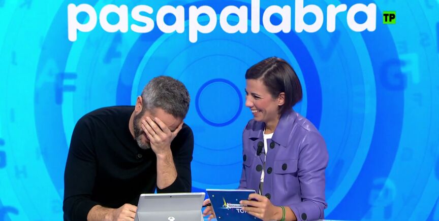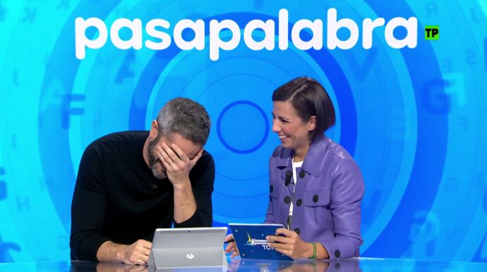 "Con la 'A': periodista que va a presentar un concurso que va a ser todo un éxito", lee él con rapidez. Pero ella, parece no saber la respuesta... para desesperación de Leal.