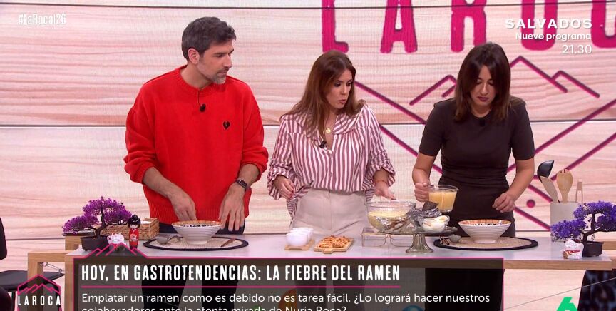 Cristina Plaza trae a La Roca una nueva 'gastrotendencia' que está revolucionando las redes sociales: ¡La fiebre del ramen! Es por eso que ha decidido poner a prueba Nacho García y Sara Ramos y les ha pedido que emplaten un ramen digno de 'like' en las redes.