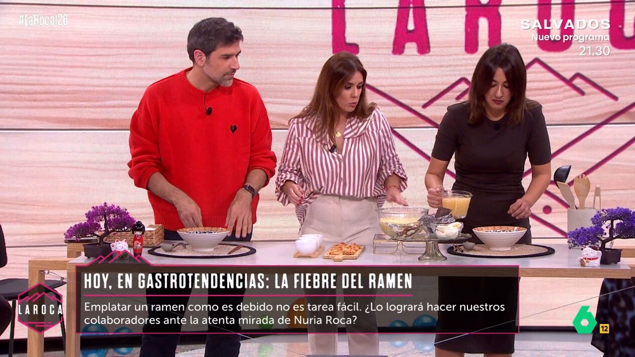 Cristina Plaza visita La Roca con la última tendencia gastronómica que arrasa en redes: ¡el ramen! Con Nacho García y Sara Ramos a los 'fogones', la diversión no para en el programa de laSexta. Descubre la 'receta' en el vídeo.
