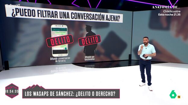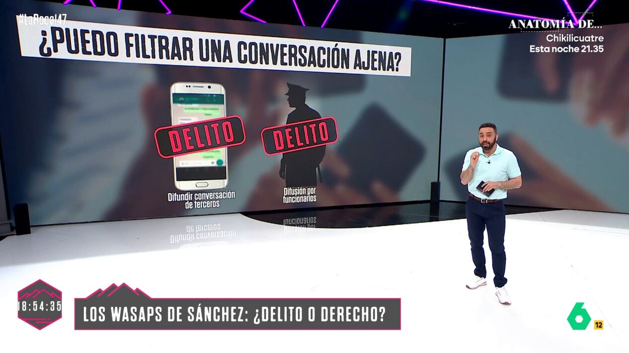 Sin embargo, hay supuestos. Está prohibido filtrar una conversación ajena y si, además, quien la filtra es el funcionario público que la custodia, la pena puede ser de hasta cuatro años de prisión. "En cambio, si la conversación es mía, puedo compartirla, y no hay delito, pero hay excepciones, que es que si se incluye imágenes íntimas de otra persona, sí que se considera delito", ha explicado el periodista de La Roca Rafa Rodrigo.