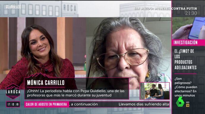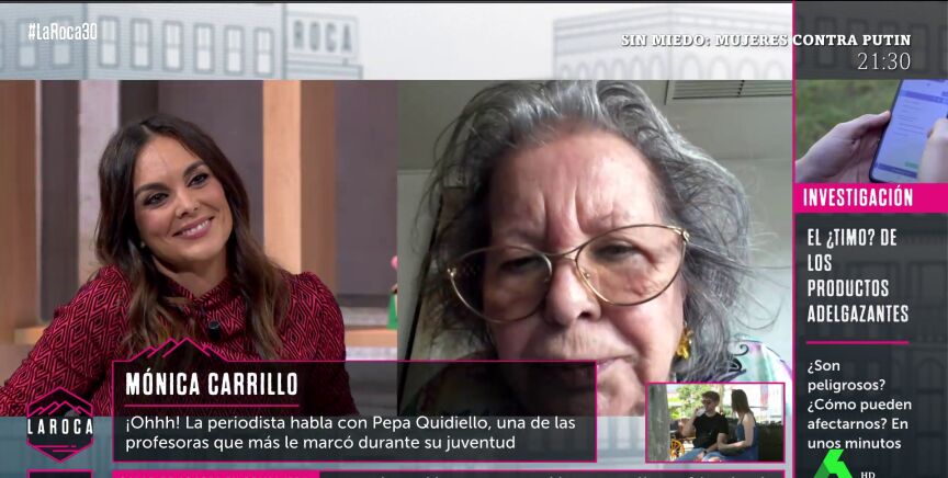 Pepa Quidiello, quien fue profesora de Historia de Mónica Carrillo y marcó su infancia, ha sorprendido a la presentadora en La Roca, al aparecer en pantalla en una conexión en directo con el plató: "¿En serio? ¡No me lo puedo creer! Estoy muy emocionada", ha expresado Carrillo al verla, a lo que ha añadido: "Fue maravilloso tenerla como maestra".