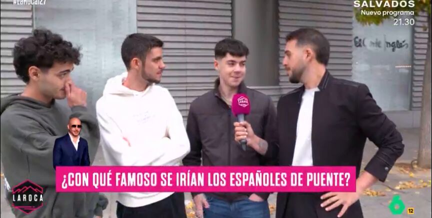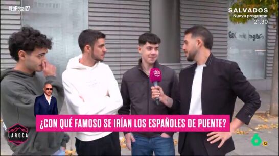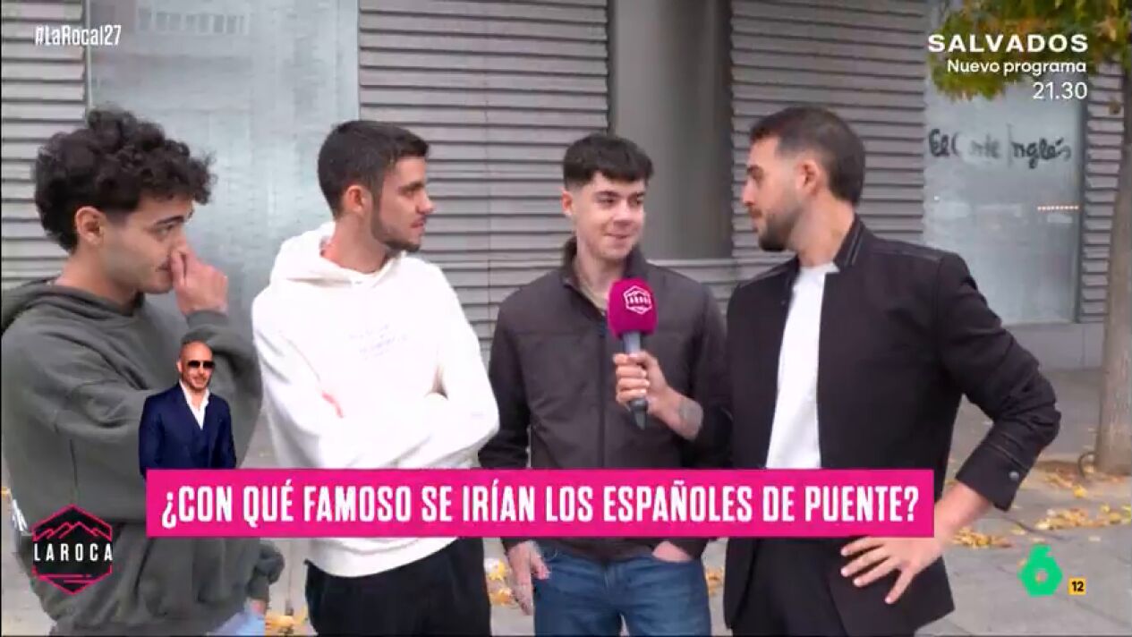 Sin embargo, La Roca quiere saber con qué famoso pasarían el puente los españoles si pudieran elegir y dónde irían, y hay respuestas de todo tipo.