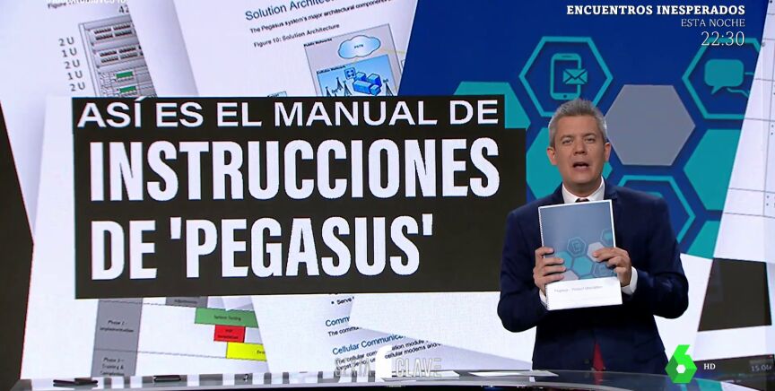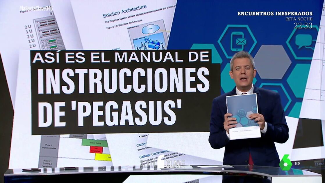 En laSexta Clave hemos tenido acceso al Manual de Instrucciones del programa 'Pegasus'. Este el libro de usuario con el que trabaja la inteligencia española. En el vídeo que acompaña estas líneas puedes observar su aspecto, es decir, lo que ven en la pantalla de su ordenador los espías de todo el mundo que trabajan con este programa: un listado de llamadas junto a un pequeño reproductor para escuchar. Para explicar su funcionamiento, el periodista Joaquín Castellón se ha metido en el papel de un comercial de 'Pegasus'.