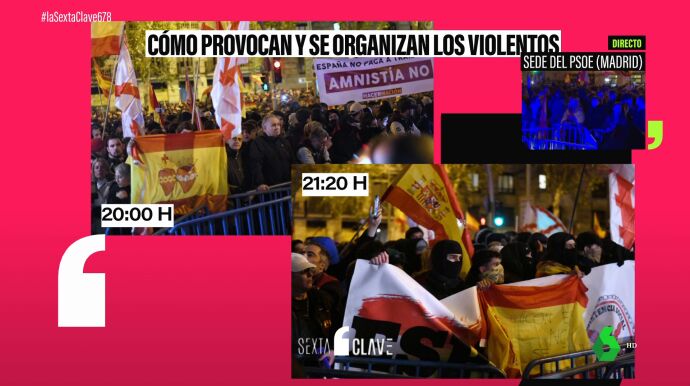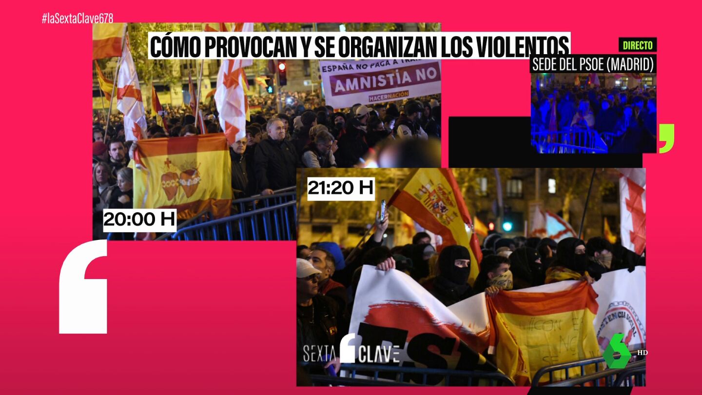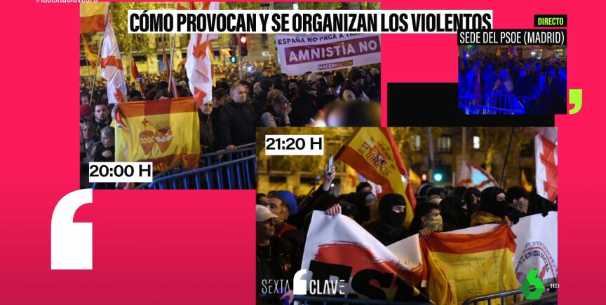 Mientras tanto, comienza a producirse la lluvia de objetos. Es ahí cuando las protestas van a más y el clima de tensión se dispara. Expertos en este tipo de disturbios consultados por laSexta Clave explican que se comunican por grupos de redes sociales, con roles de liderazgo que dan órdenes incluso del momento en el que empezar con la violencia.