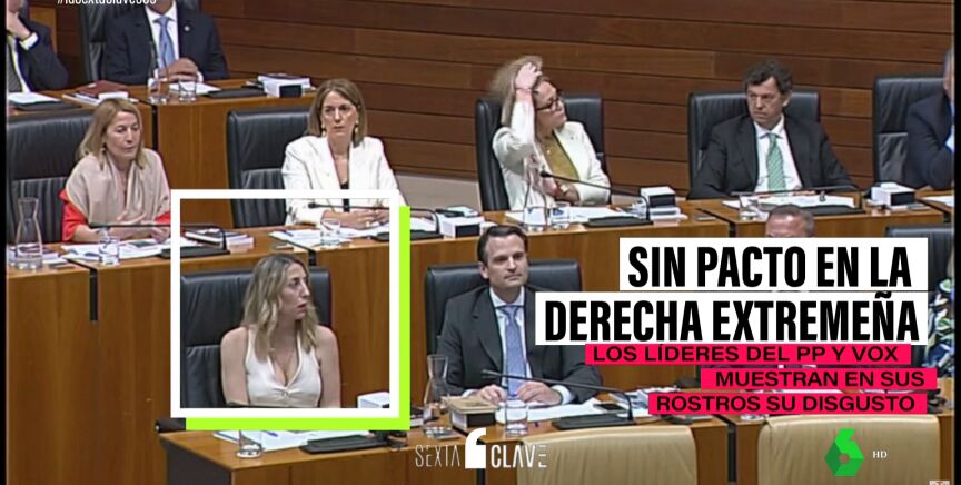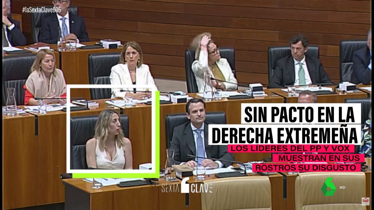 El desacuerdo se impuso entre el PP y Vox en Extremadura y la presidencia de la Asamblea ha quedado en manos del PSOE. Las caras serias de los diputados de la derecha y la extrema derecha escenificaban su distanciamiento.