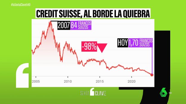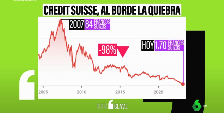 Desde 2007, Credit Suisse ha perdido el 98% de su valor, pasando de valer 84 francos suizos a los menos de 2 actuales. La lenta agonía de la entidad viene de la última crisis financiera; desde entonces, su caída ha sido lenta, constante e inevitable.