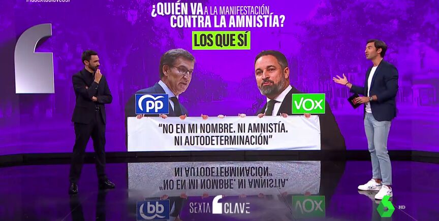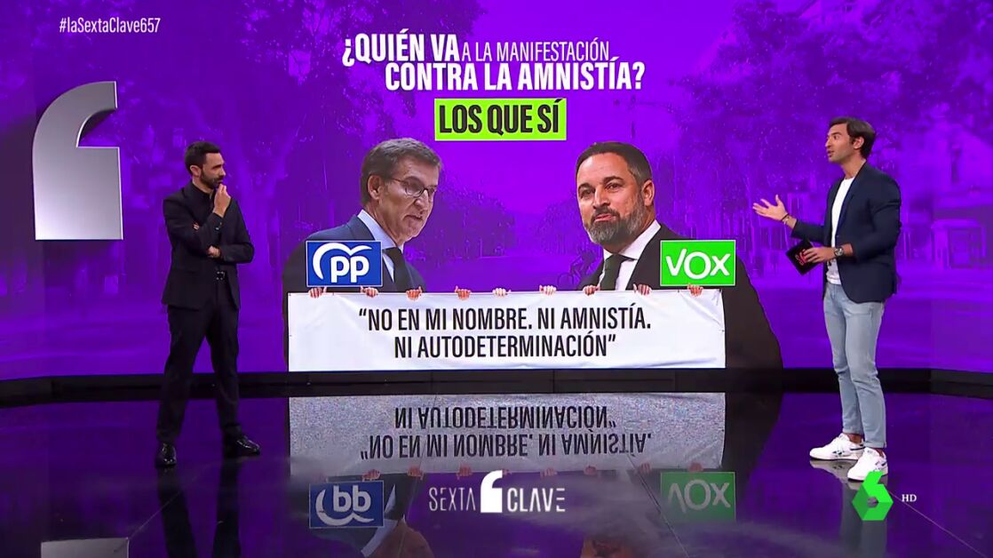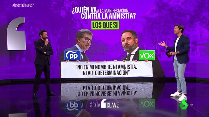 Además, hoy mismo el presidente de la Generalitat, Pere Aragonés, ha dicho que la amnistía ya "es un hecho". Mientras que desde el Partido Nacional Vasco (PNV), su portavoz en el Congreso, Aitor Esteban, ha expresado que el tema de la amnistía "no está cerrado ni mucho menos". Por si acaso, y a la espera de saber en qué queda, la derecha no quiere dejar pasar la ocasión para decir la suya. El próximo domingo 8 de octubre van a protestar por el centro de Barcelona contra esa hipotética amnistía. Manifestación convocada por Societat Civil Catalana y a la que va mucho político de derecha. ¿Quién va el domingo a la manifestación contra la amnistía?