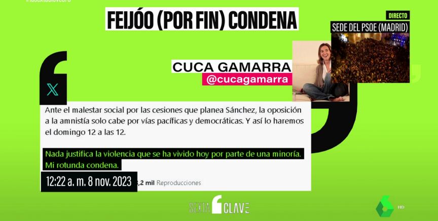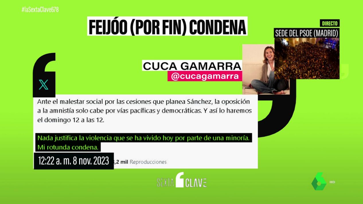 El presidente del PP, Alberto Núñez Feijóo, finalmente emite una firme condena ante los actos de violencia desatados durante las últimas protestas frente a la sede del PSOE. A través de su cuenta de Twitter, Feijóo afirmó que "ni como la minoría que actúa igual" se pueden justificar estos actos vandálicos, subrayando la importancia de que las manifestaciones se lleven a cabo desde el respeto y la ejemplaridad.