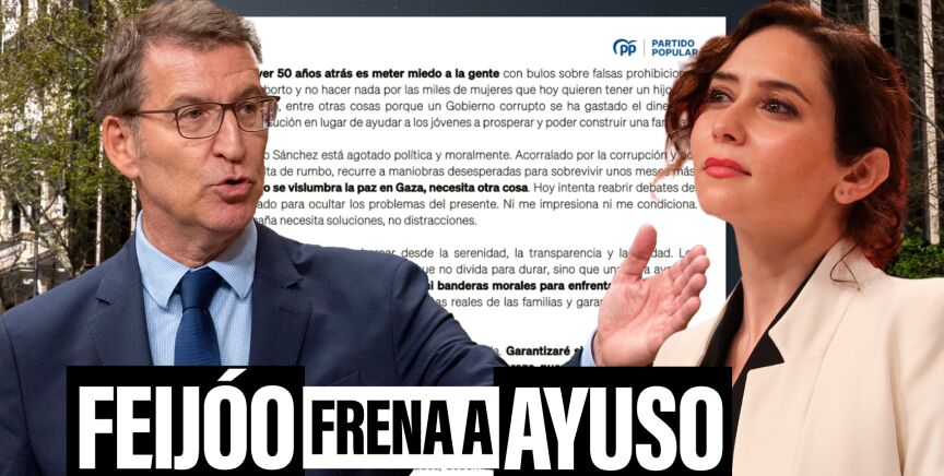 La tensión entre Feijóo y Ayuso va mucho más allá del aborto. Mientras Feijóo busca un PP de centro, moderado y sin polémicas que beneficien al Gobierno, Ayuso empuja al partido hacia la extrema derecha. Otro ejemplo: con protestas multitudinarias en las calles por Gaza; Ayuso ha respaldado totalmente a Israel, Feijóo habla de "masacre" y el PP de Madrid insulta a quienes se manifiestan. Cada gesto deja en evidencia la brecha entre Génova y la Puerta del Sol.