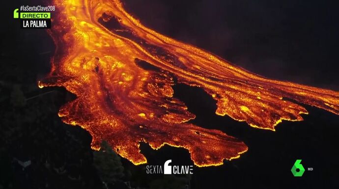 La erupción del volcán de la Cumbre Vieja de La Palma ha brotado con más fuerza después de que parara brevemente su actividad durante unas horas este lunes. Tras recuperarse, el magma corre por las laderas a una velocidad más rápida que en las últimas jornadas. Esto se explica porque la enorme colada 'cabalga' sobre las dos creadas previamente y se desliza por un terreno que ya ha sido allanado, como si de un tobogán se tratara.
