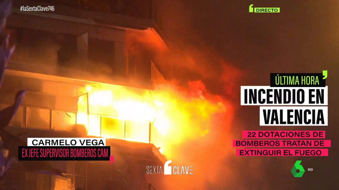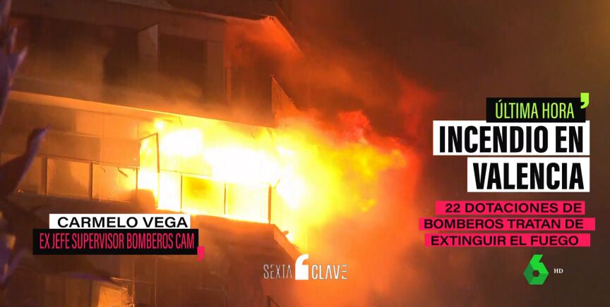El terrible incendio que ha asolado este jueves un gran edificio residencial en Valencia dejaba escenas tan angustiosas como el agónico rescate de dos personas que han permanecido atrapadas durante largo rato en el balcón de una vivienda. Carmelo Vega, ex jefe supervisor de bomberos de la Comunidad de Madrid, define esta operación como "una labor precisa y preciosa" por parte de los Bomberos.