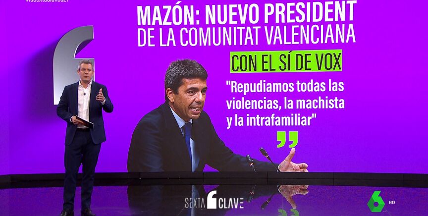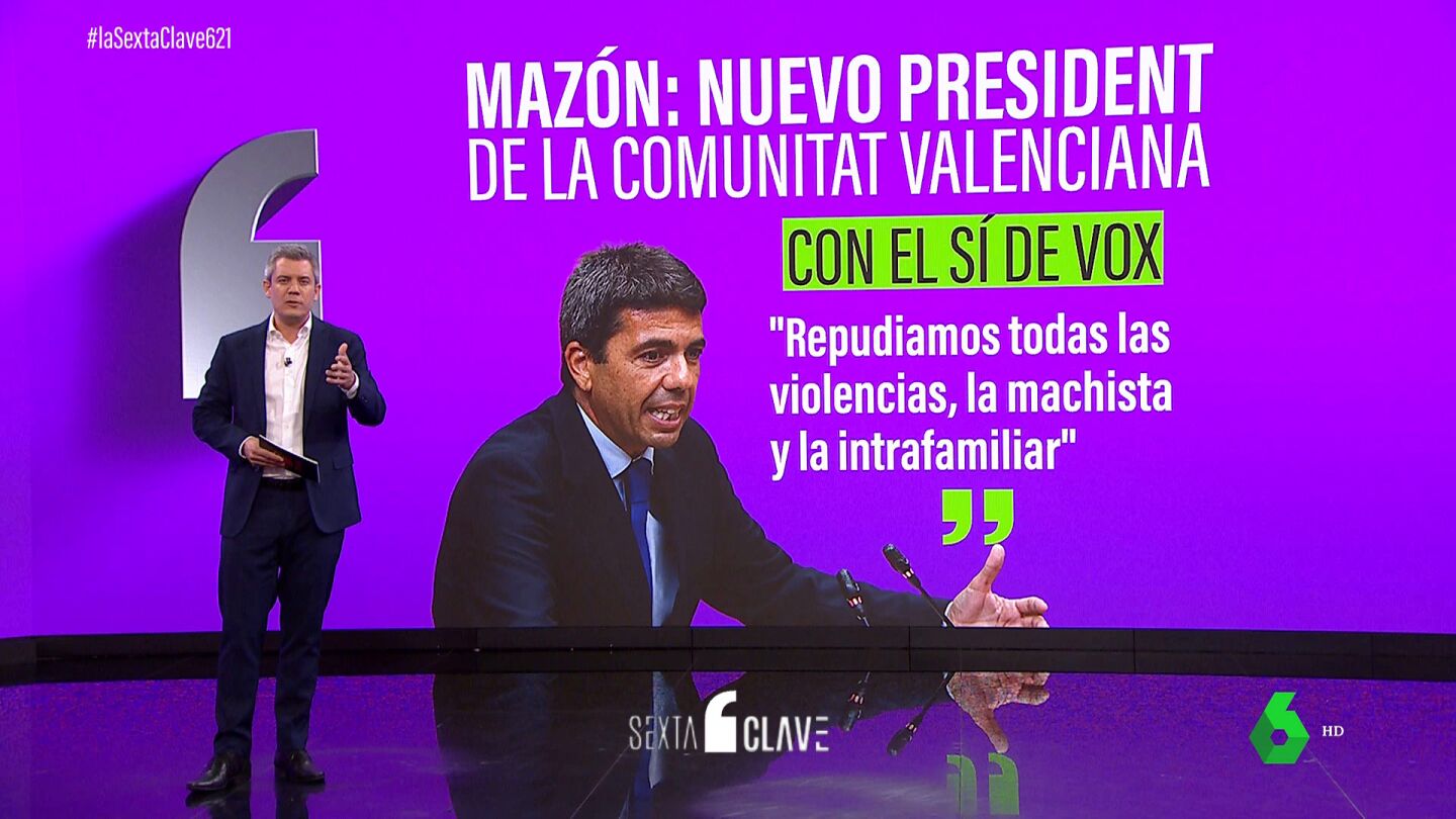 Ahora es el president de la Generalitat valenciana. En campaña llegó a decir que su línea roja era gobernar en solitario, pero no pudo darse más prisa en pactar para formar gobierno y ahora los coros los hace con la ultraderecha. En su sesión de investidura, el 'popular' ha hecho un guiño a sus socios de Vox: primero ha dicho que nadie puede negar la violencia "machista", pero justo a continuación ha dicho que también está en contra de la violencia "intrafamiliar".