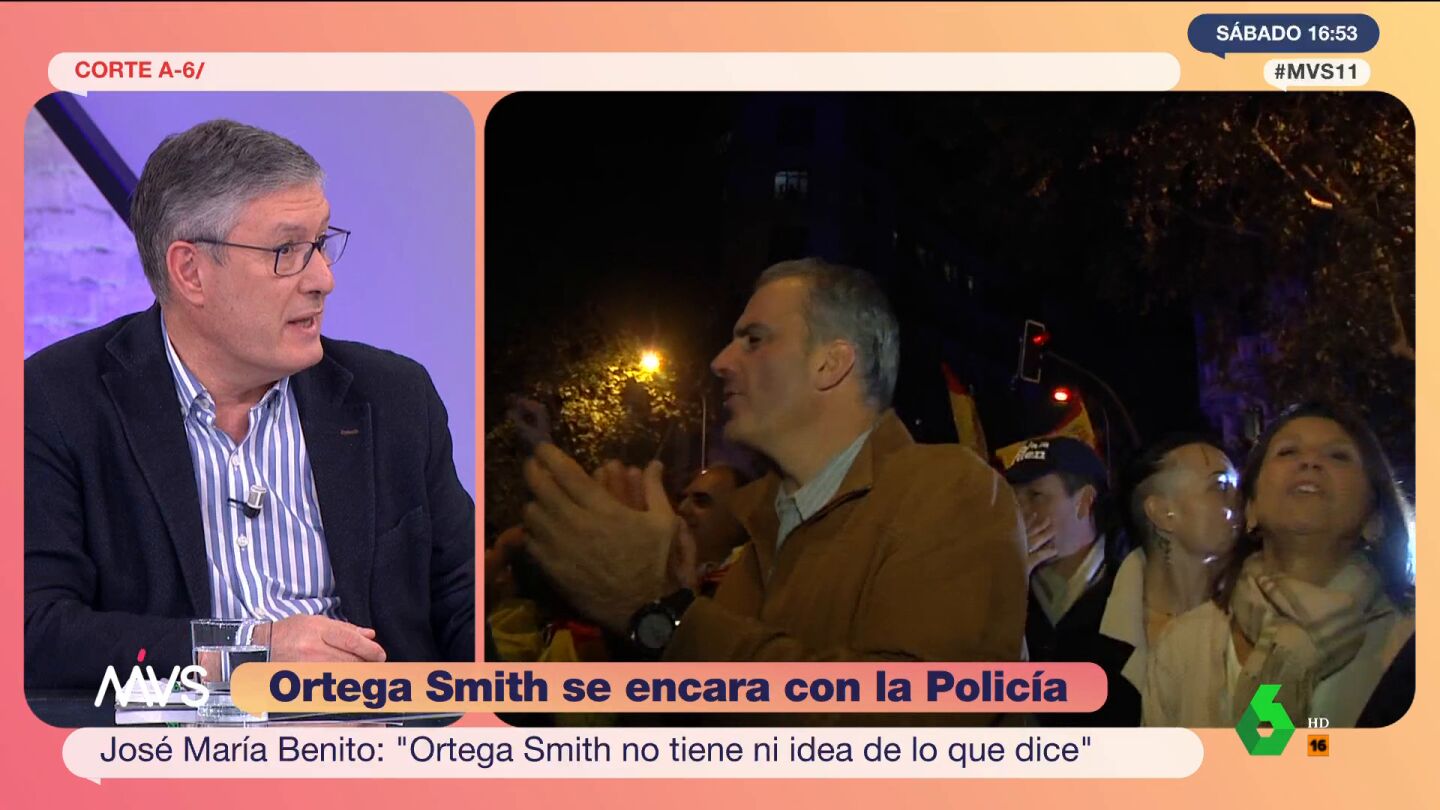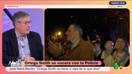 El inspector de Policía José María Benito ha sido "muy claro" en Más Vale Tarde en lo referente al comportamiento de Ortega Smith con la Policía durante la noche del pasado jueves, en la que se encaró con agentes y les acusó de cometer "abusos de autoridad". "Yo soy el responsable de ese dispositivo policial y el señor Ortega Smith se va detenido, sin duda", ha reconocido Benito, quien ha defendido que "por supuesto" es posible detener al diputado de Vox ante esa actuación.